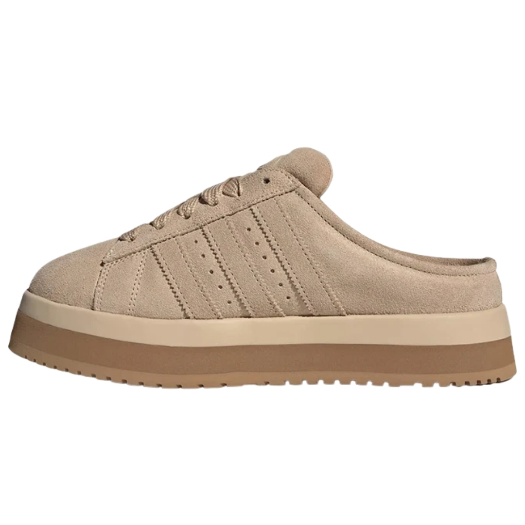 Cholewka jest wykonana z miękkiego zamszu w kolorze beżowym. Materiał wygląda premium i dobrze układa się na stopie. Na bokach znajdują się trzy paski adidas, które od razu kojarzą się z klasyczną linią Campus. Beżowa baza sprawia, że but pasuje do większości garderoby: do jeansów, dresów i szerokich spodni.
