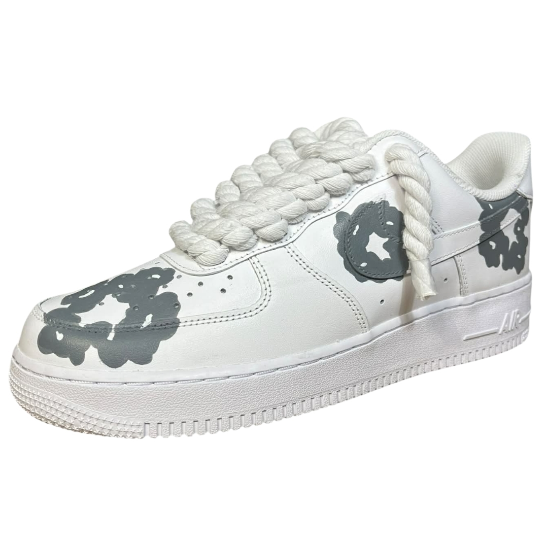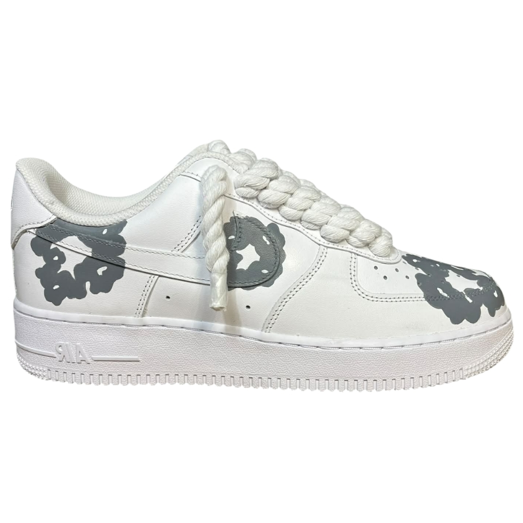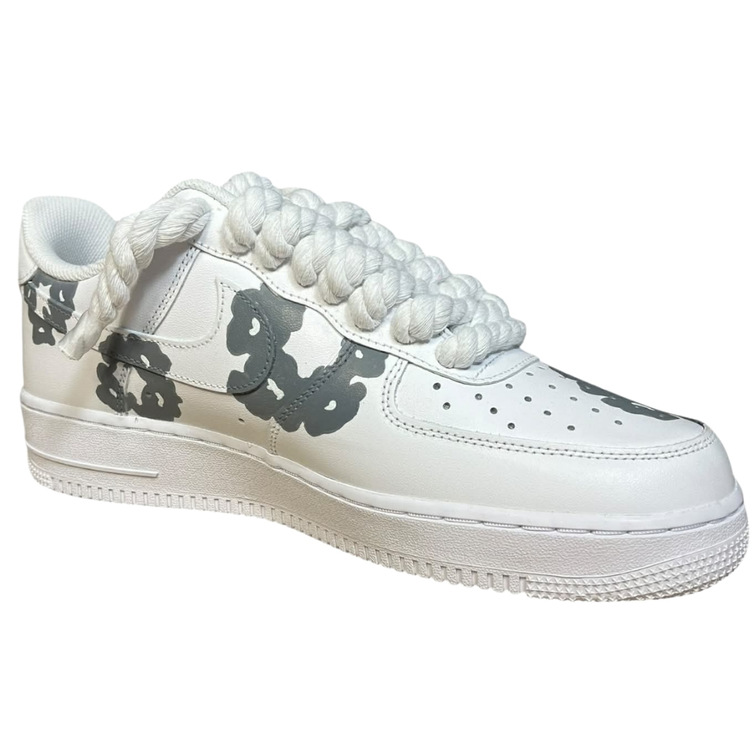 Air Force 1 White Rope Lace „Denim Tears Custom” to białe Air Force 1 low przerobione na wyrazisty, artystyczny custom. Na skórzanej, śnieżnobiałej cholewce pojawiają się szare, nieregularne motywy w stylu Denim Tears, rozmieszczone na toeboxie, bokach i tyle buta.
