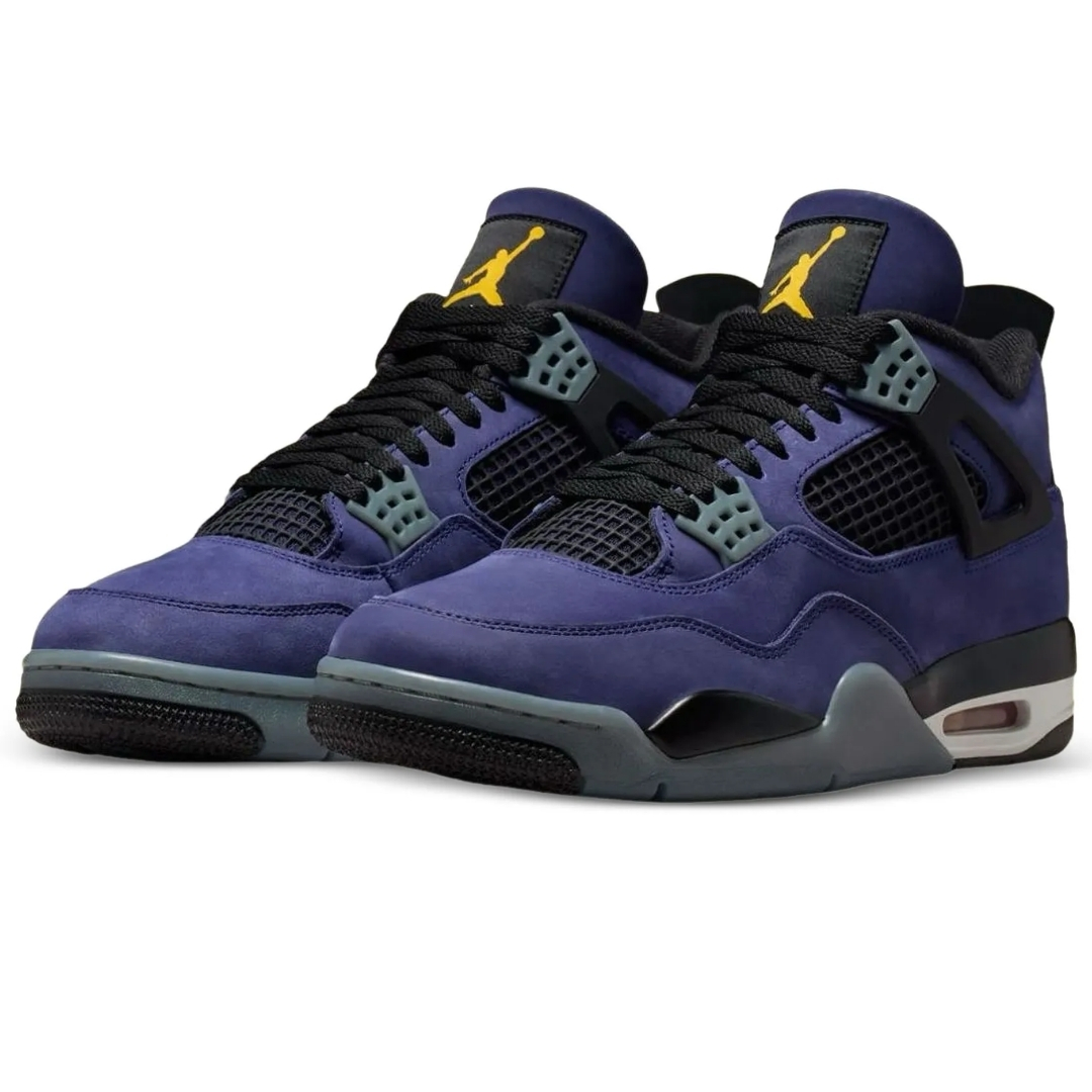 Air Jordan 4 Lakers to kolorystyka inspirowana Los Angeles Lakers. Fioletowy nubuk i złote detale tworzą klasyczny „Purple & Gold”. Model zachowuje proporcje AJ4. Łączy wygodę z koszykarską estetyką.