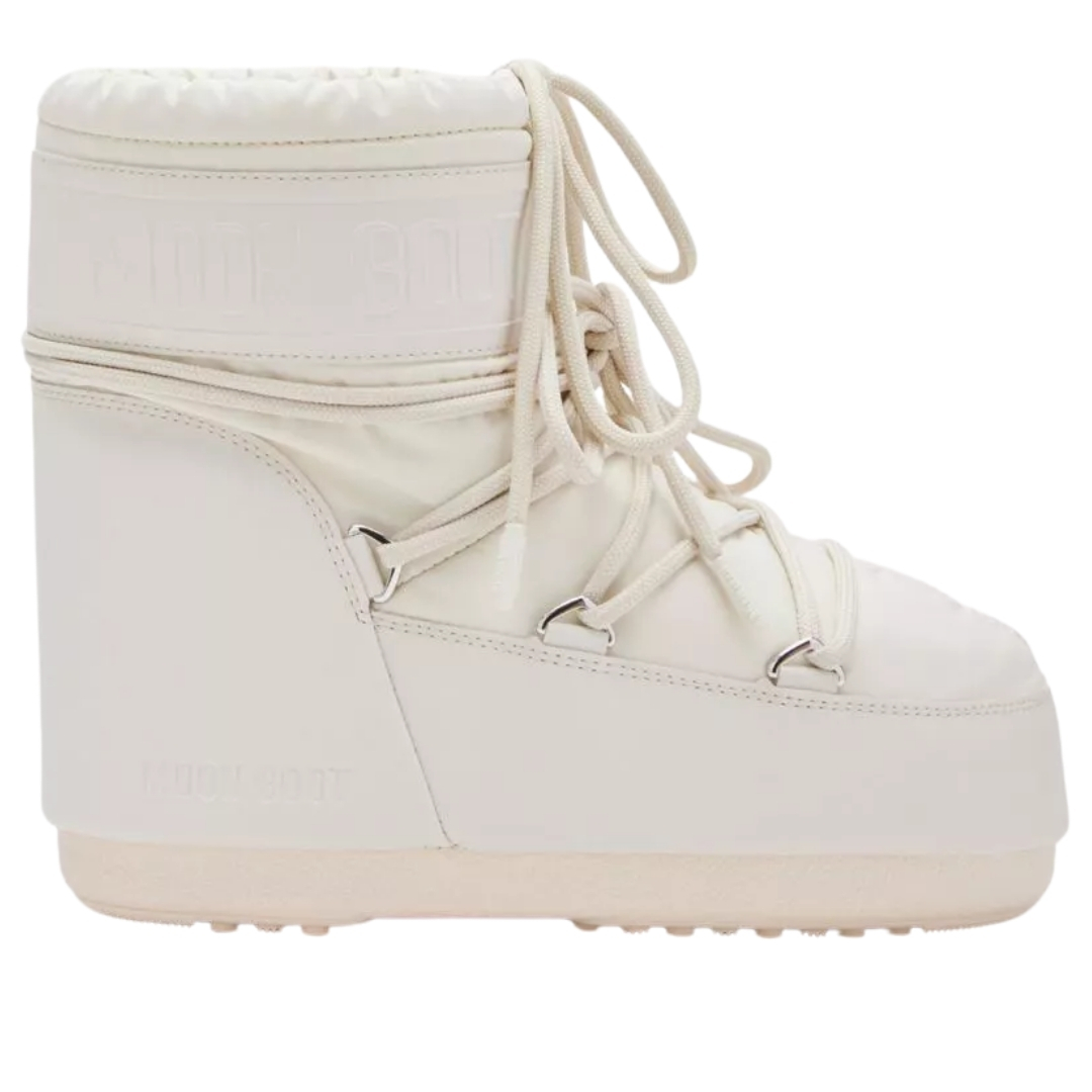Cholewka wykonana jest z wodoodpornego PVC i gumowanego syntetyku. Z przodu klasyczne sznurowanie dopasowuje but do stopy. Na górze troczki regulują obwód cholewki. Z boku wytłoczone kremowe logo Moon Boot.