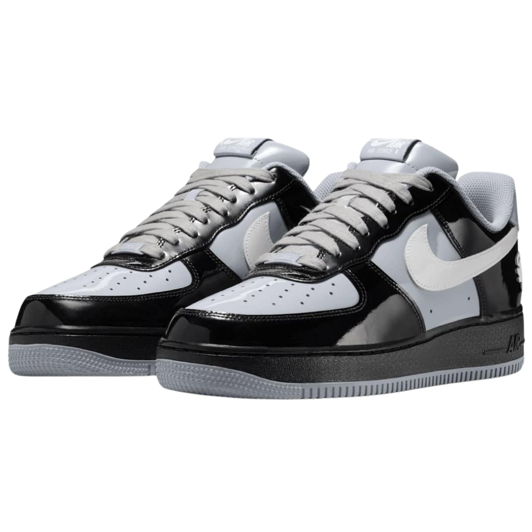 Cholewka z błyszczącej skóry patentowej. Czarny kolor dominuje. Smoke Grey na toebox i midpanelu. Biały Swoosh kontrastuje. Materiały wysokiej jakości.
