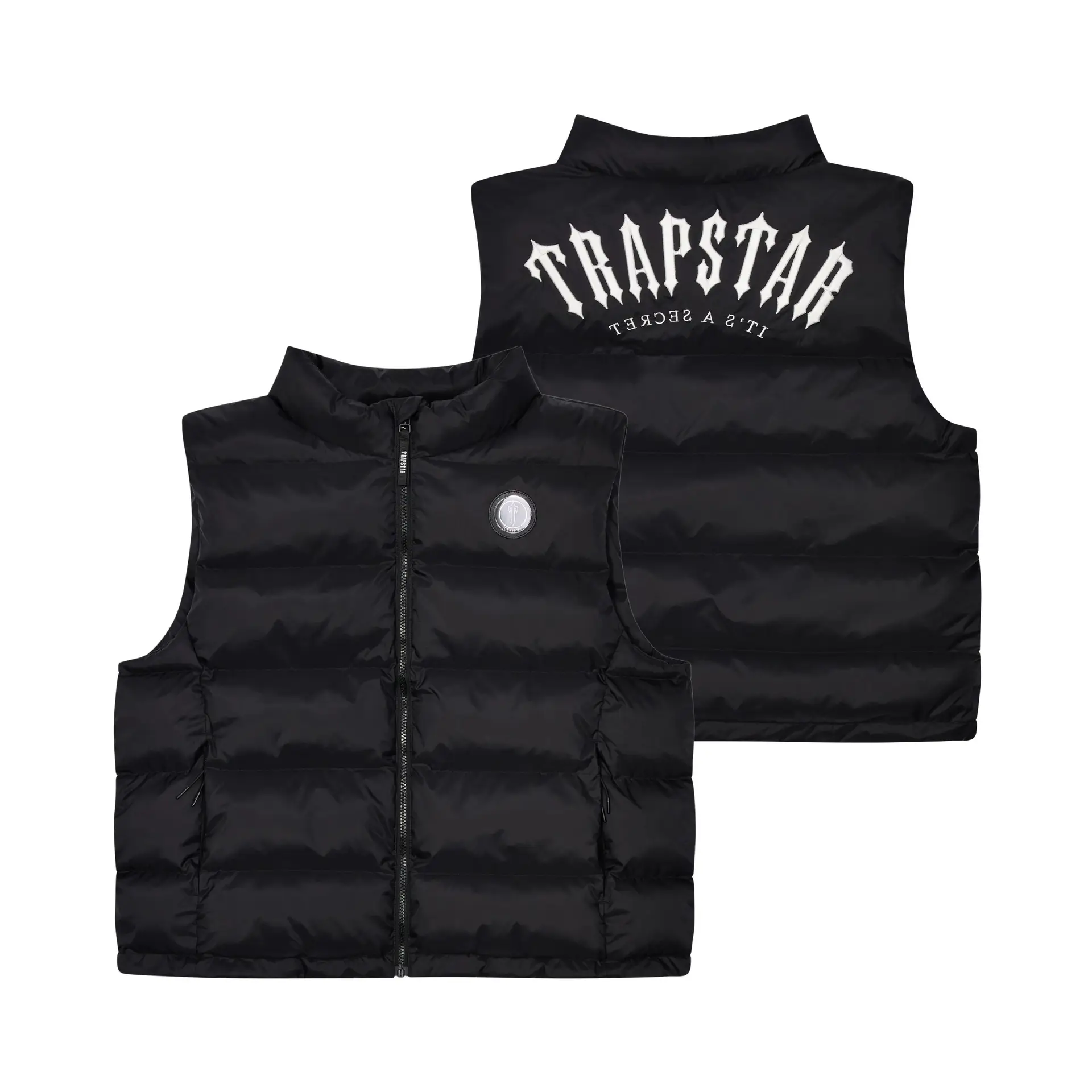 Charakterystycznymi detalami są okrągła gumowa naszywka Irongate na piersi oraz gumowa naszywka „T” z tyłu, które subtelnie podkreślają przynależność do marki Trapstar. Bezrękawnik posiada wysoką stójkę, przedni zamek na całej długości oraz praktyczne kieszenie zewnętrzne, a także ukrytą kieszeń wewnętrzną dla cennych przedmiotów. Wewnętrzny zamek został ozdobiony brandingiem „IT’S A SECRET”, co jest charakterystycznym elementem filozofii marki.