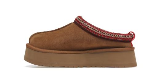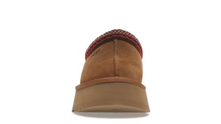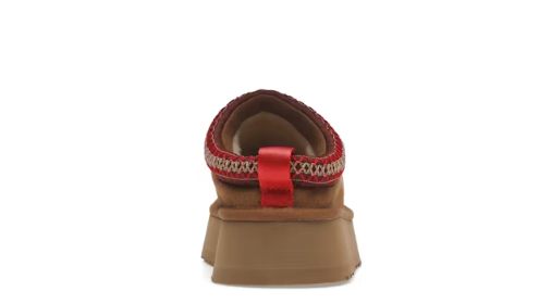 UGG Tazz Slipper Chestnut (Women’s) — kasztanowe kapcie na platformie z zamszem, czerwonymi zdobieniami UGGbraid i wyściółką UGGplush™. Komfort domowy i street style w jednym.